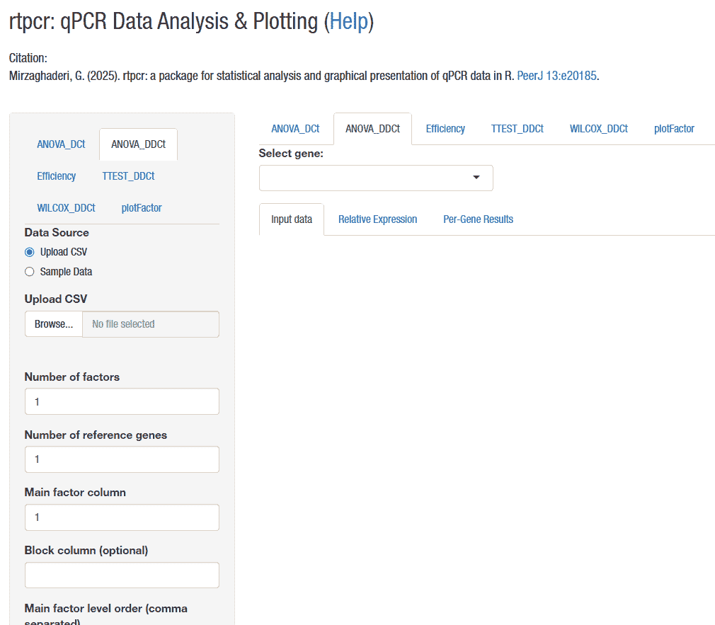 For relative expression analysis (using TTEST_DDCt, WILCOX_DDCt, ANOVA_DCt, and ANOVA_DDCt functions), the amplification efficiency (E) and Ct or Cq values (the mean of technical replicates) is used for the input table. If the E values are not available you should use ‘2’ instead representing the complete primer amplification efficiency. The input data table should include the following columns from left to wright:
