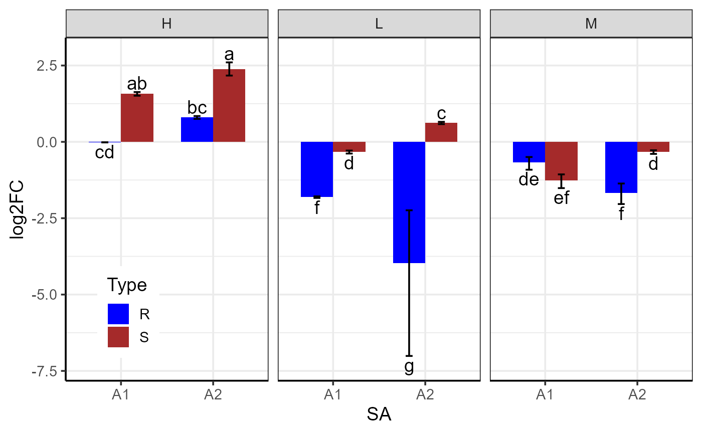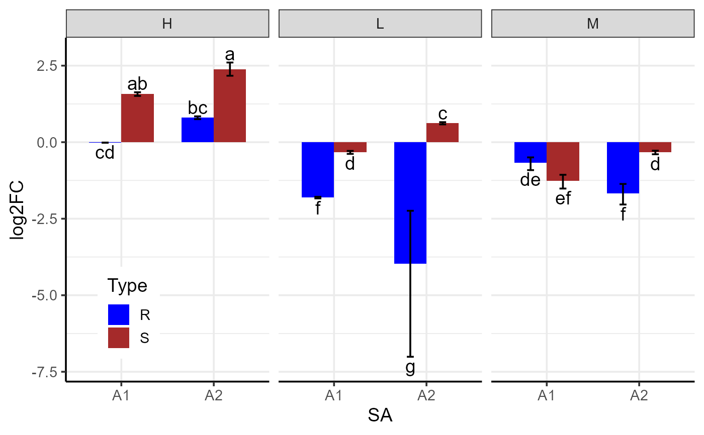 plotFactor.RdCreates a bar plot of relative gene expression (fold change) values from 1-, 2-, or 3-factor experiments, including error bars and statistical significance annotations.